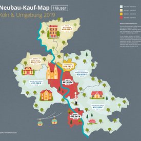 Ein Neubau-Einfamilienhaus kostet zum Jahresende 2018 in Köln im Durchschnitt 661.852 Euro, das sind 10,6 Prozent mehr als zum Ende 2017. Damit sind neue Häuser in der Domstadt auch im prozentualen Anstieg Spitzenreiter in der Region. Aber auch in den Nachbarstädten steigen die Preise: In Bonn eher moderat um 5,8 Prozent auf durchschnittlich 612.141 Euro für ein Neubau-Haus, in Leverkusen um 6,5 Prozent auf 504.183 Euro. Im regionalen Vergleich am günstigsten ist der Erwerb eines neuen Einfamilienhauses im Rhein-Sieg-Kreis mit 418.106 Euro (+ 9,6 Prozent).