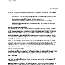 Neben dem Spitzenreiter Dortmund (+8 Prozentpunkte) zeigen auch Essen (+4 Prozentpunkte), Frankfurt am Main und Düsseldorf (jeweils +3 Prozentpunkte) sowie Berlin und Hamburg (jeweils +2 Prozentpunkte) positive Entwicklungen im Quartalsvergleich.