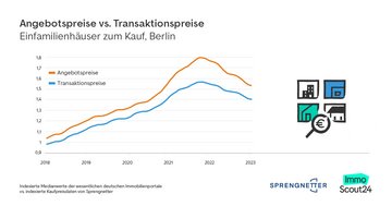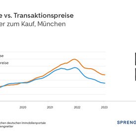 Die Immobilienpreise kannten zur Zeit der Niedrigzinsen nur eine Richtung: nach oben. So sind die Angebotspreise für Immobilien zum Kauf von 2018 bis 2022 um mehr als 50 Prozent gestiegen. Seit dem Frühjahr des letzten Jahres geht der Trend zurück. Eine aktuelle Auswertung von Sprengnetter und ImmoScout24 zeigt, dass die Transaktionspreise, die tatsächlich erzielten Verkaufspreise, bereits seit 2021 langsamer ansteigen als die Angebotspreise. Seither geht die Schere zwischen Angebots- und Transaktionspreisen weiter auseinander. Für Immobilienkäufer:innen bedeutet das mehr Verhandlungsspielraum.