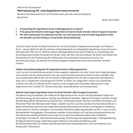 „Dort, wo die Immobilienpreise aufgrund des knappen Angebots und einer hohen Nachfrage gestiegen sind, werden die Grundsteuerwerte nach der neuen Festsetzung wahrscheinlich höher ausfallen. Das wird insbesondere Menschen mit Immobilien in Ballungszentren und den umliegenden Speckgürteln, aber auch in begehrten Urlaubsregionen treffen. In Zeiten von steigenden Zinsen und anhaltender Inflation, wird die Grundsteuerreform damit zu einer zusätzlichen finanziellen Belastung für viele Eigentümer:innen“, erklärt Dr. Thomas Schroeter, Geschäftsführer von ImmoScout24.