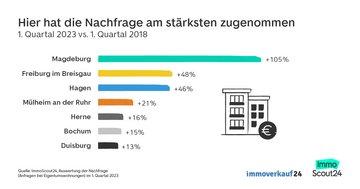 Auf Platz zwei bei der Zunahme der Nachfrage liegt Freiburg im Breisgau mit einem Plus von 48 Prozent, nur knapp dahinter mit 46 Prozent folgt Hagen. Wieder unter den Top 5 zu finden ist Mühlheim an der Ruhr, jedoch mit etwas größerem Abstand und einer Nachfrage-Zunahme von 21 Prozent. Und auch Bochum findet sich mit einem um 16 Prozent gestiegenen Interessen an Eigentumswohnungen wieder unter den Top-platzierten Städten.