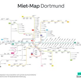 Durchschnittlich sind die Mietpreise in Dortmund für eine 70-Quadratmeter-Bestandswohnung im Vergleich zum Vorjahr um 3,8 Prozent gestiegen. Für keine Station entlang des öffentlichen Nahverkehrsnetzes konnte eine Verringerung verzeichnet werden.