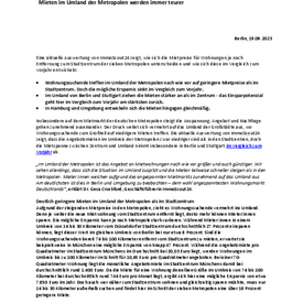 „Im Umland der Metropolen ist das Angebot an Mietwohnungen nach wie vor größer und auch günstiger. Wir sehen allerdings, dass sich die Situation im Umland zuspitzt und die Mieten teilweise schneller steigen als in den Metropolen. Mieter:innen weichen aufgrund des angespannten Mietmarkts zunehmend auf das Umland aus. Am deutlichsten ist dies in Berlin und Umgebung zu beobachten – dem wohl angespanntesten Wohnungsmarkt Deutschlands“, erklärt Dr. Gesa Crockford, Geschäftsführerin ImmoScout24.