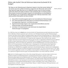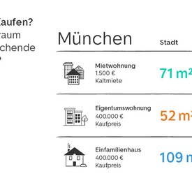 Der Immobilienmarkt in München bietet den Suchenden für 1.500 Euro mit rund 71 Quadratmetern die kleinsten Mietwohnungen im Metropolenvergleich. Eigentumswohnungen für 400.000 Euro bieten im Durchschnitt nur 52 Quadratmeter Wohnfläche. Einfamilienhäuser werden im Münchener Stadtgebiet so gut wie gar nicht angeboten. Im Umland der bayerischen Landeshauptstadt sind Häuser unter 500.000 Euro selten, aber es gibt sie – mit durchschnittlich 125 Quadratmeter Wohnfläche. Eigentumswohnungen im Umland werden in dieser Preisklasse mit rund 74 Quadratmeter angeboten, und das Angebot ist sogar größer als in München selbst. Eine Eigentumswohnung im Umland bietet bei einer Finanzierung mit einer monatlichen Kreditrate von 1.500 Euro also sogar ein wenig mehr Platz als innerhalb der Stadt.