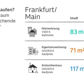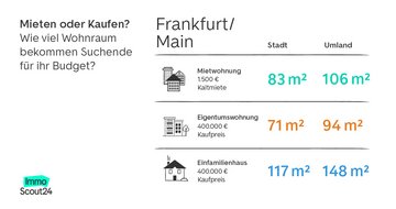 In Frankfurt am Main bieten Mietwohnungen für 1.500 Euro durchschnittlich 83 Quadratmeter, im Umland gibt es dafür 106 Quadratmeter. Wer nach Kaufimmobilien sucht, findet innerstädtisch für 400.000 Euro ungefähr 71 Quadratmeter große Wohnungen, im Umland 94 Quadratmeter. Damit bekommt man für eine monatliche Kreditrate von 1.500 Euro deutlich mehr Wohnraum in einer Eigentumswohnung im Frankfurter Umland als für eine Mietwohnung in der Bankenmetropole. Interessant: Im Umland werden doppelt so viele Eigentumswohnungen angeboten als in der Stadt. Fast gleich groß ist das Angebot an Einfamilienhäusern zum Kauf im Frankfurter Umland. Sie haben für einen Angebotspreis von 400.000 Euro im Durchschnitt rund 148 Quadratmeter Wohnfläche. Im Stadtgebiet sind Einfamilienhäuser für diesen Preis eine Ausnahmeerscheinung. Wenn man sie findet, haben sie durchschnittlich 117 Quadratmeter Wohnfläche.