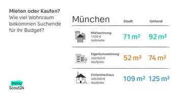 Der Weg von der Mietwohnung ins Eigenheim beginnt in den Metropolen häufig mit der Suche nach einer größeren Wohnung. Angesichts der Mietpreise stellt sich für Viele bald die Frage: Was kann ich mir eigentlich leisten, wenn ich eine Immobilie kaufe statt miete? Und sollte ich besser in der Großstadt oder im Umland suchen? Eine aktuelle ImmoScout24-Analyse vergleicht die Wohnflächen von Kaufobjekten für 400.000 Euro mit vergleichbaren Mietobjekten für 1.500 Euro Kaltmiete in den sieben größten Metropolen und deren Umland.