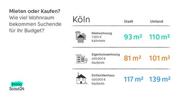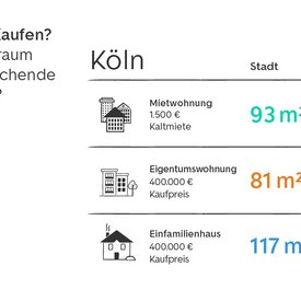Köln sticht im Städtevergleich hervor: Es ist die einzige Metropole, in der das Umland nicht nur ein größeres Angebot an Einfamilienhäusern und Eigentumswohnungen, sondern auch mehr Mietwohnungen bietet als die Millionenstadt. Für 1.500 Euro finden sich Mietwohnungen in Köln mit durchschnittlich 93 Quadratmeter, im Umland gibt es 110 Quadratmeter. Eigentumswohnungen für 400.000 Euro bieten in der Domstadt im Durchschnitt 81 Quadratmeter und 101 Quadratmeter Wohnfläche im Speckgürtel. Einfamilienhäuser in dieser Preisregion sind in Köln im Mittel mit 117 Quadratmeter zu finden – aber im Umland bieten Häuser in dieser Preisklasse 139 Quadratmeter, und das Angebot ist zehnmal so groß.