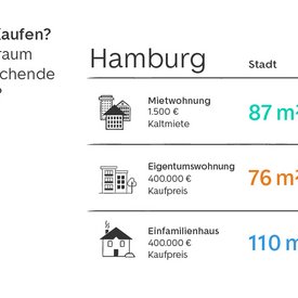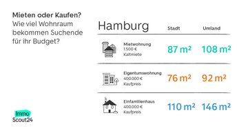In Hamburg lassen sich für 1.500 Euro Kaltmiete etwa 85 Quadratmeter große Mietwohnungen finden. Im Umland sind sie 108 Quadratmeter groß. Eigentumswohnungen für 400.000 Euro bieten in der Hansestadt 73 Quadratmeter Fläche, im Umland 99 Quadratmeter. Wer im Hamburger Umland also nach einer Wohnung sucht, ist gut beraten auch den Kauf in Betracht zu ziehen, da die Wohnungsgröße bei Kauf und Miete annährend auf demselben Niveau liegt. Schaut man nach Einfamilienhäusern, so lassen sich im Stadtgebiet in diesem Preissegment Kaufobjekte mit 109 Quadratmetern finden. Das Angebot ist im Umland allerdings mehr als zehnmal so groß und Häuser bieten dort im Mittel 135 Quadratmeter Wohnfläche.