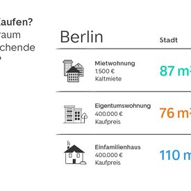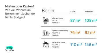 Für 1.500 Euro lässt sich in Berlin eine durchschnittlich 87 Quadratmeter große Stadtwohnung mieten. Wer ins Berliner Umland ausweicht, kann mit einer rund 108 Quadratmeter großen Mietwohnungen rechnen. Der Blick auf den Markt für Kaufimmobilien zeigt: Mit einem Monatsbudget von 1.500 Euro lässt sich in der Regel ein Kaufobjekt für 400.000 Euro finanzieren. Für dieses Budget werden in Berlin aktuell Stadtwohnungen mit durchschnittlich 76 Quadratmeter angeboten. Man bekommt also deutlich weniger Wohnraum bei einer Eigentumswohnung als bei einer vergleichbaren Mietwohnung. Im Berliner Umland erhalten Kaufinteressent:innen für 400.000 Euro hingegen 92 Quadratmeter und damit 16 Quadratmeter mehr für ihr Geld. Wer stattdessen nach Einfamilienhäusern zum Kauf schaut, kann in Berlin mit 110 Quadratmetern Wohnfläche bzw. im Speckgürtel mit 146 Quadratmeter Eigenheim rechnen. Das Angebot unterscheidet sich hierbei jedoch enorm: Im Berliner Umland sind in der Preisklasse von 400.000 Euro ungefähr zehnmal so viele Einfamilienhäuser inseriert als im Stadtgebiet. Genau umgekehrt liegt das Verhältnis bei Eigentumswohnungen, von denen zehnmal mehr in der Stadt als im Umland angeboten werden. Am größten ist das Angebot an Mietwohnungen in der Stadt, gefolgt von städtischen Eigentumswohnungen und Einfamilienhäusern zum Kauf im Berliner Umland.