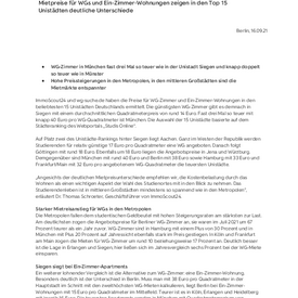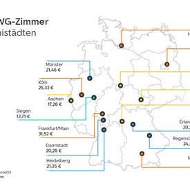 ImmoScout24 und wg-suche.de haben die Preisentwicklung von WG-Zimmern und Ein-Zimmer-Wohnungen in den 15 beliebtesten Unistädten Deutschlands analysiert. Hierzu wurden die von studis-online.de herausgearbeiteten zehn Städte ab 100.000 Einwohnern mit den höchsten Studentenanteilen an der Stadtbevölkerung, sowie die fünf Städte mit den absolut in Zahlen meisten Studenten herangezogen. Hinweis: Göttingen ist mit Kreis Göttingen berücksichtigt und Siegen mit dem Siegen-Wittgenstein Kreis.