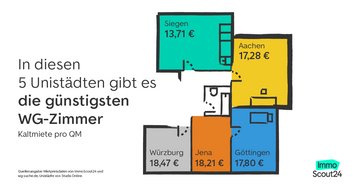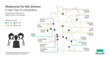 ImmoScout24 und wg-suche.de haben die Preise für WG-Zimmer und Ein-Zimmer-Wohnungen in den beliebtesten 15 Unistädten Deutschlands ermittelt. Die günstigsten WG-Zimmer gibt es demnach in Siegen mit einem durchschnittlichen Quadratmeterpreis von rund 14 Euro. Fast drei Mal so teuer mit knapp 40 Euro pro WG-Quadratmeter ist München. Die Auswahl der 15 Unistädte basierte auf dem Städteranking des Webportals „Studis Online“.