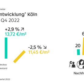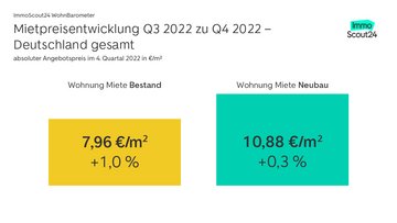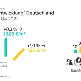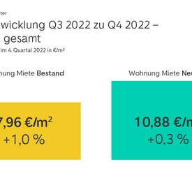Die Angebotsmieten für Bestands- und Neubauwohnungen legen im vierten Quartal weiter zu. Im Bestand steigen die Angebotsmieten um 1,0 Prozent auf 7,96 Euro pro Quadratmeter. Im Neubau liegt der Angebotspreis im vierten Quartal bei 10,88 Euro pro Quadratmeter. Das entspricht einer Steigerung von 0,3 Prozent. Der starke Preiszuwachs aus dem Vorquartal schreibt sich im vierten Quartal demnach nicht fort. Im dritten Quartal lag die Preisentwicklung für Bestandmietwohnungen bei 2,9 Prozent und für Neubaumietwohnungen bei 2,5 Prozent. Die Gesamtwohnkosten steigen aufgrund stark erhöhter Energiekosten dennoch an. Im Dezember 2022 machen die Nebenkosten im Schnitt 18,3 Prozent der Gesamtmiete aus.