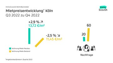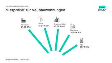 Das ImmoScout24 WohnBarometer ist der Marktreport zur Entwicklung des Immobilienmarkts. Herausgeber ist ImmoScout24: Deutschlands führende Online-Plattform für Wohnimmobilien. Das ImmoScout24 WohnBarometer gibt die Preisentwicklung in realen Angebotspreisen wieder, ergänzt um einen Indikator zum Verhältnis von Angebot und Nachfrage. Die Datenbasis umfasst über 8,5 Millionen Inserate der letzten fünf Jahre auf ImmoScout24. Dabei werden alle Mietwohnungsinserate analysiert. Die Werte werden für Referenzobjekte für den jeweils betrachtetem Immobilientyp durch einen Algorithmus aus dem Bereich des maschinellen Lernens ermittelt. Das Referenzobjekt für Mietwohnungen ist eine Zwei-Zimmer-Bestandswohnung mit 70 Quadratmetern. Die Kategorie Neubau enthält alle Angebote mit einem Baualter von maximal zwei Jahren zum jeweiligen Bestimmungszeitpunkt. Die Nachfrage im Verhältnis zum Angebot wird berechnet auf Basis der Kontaktanfragen pro Inserat des jeweiligen Immobilientyps pro Woche. Es handelt sich um einen normierten Wert, um unterschiedliche Standzeiten der Anzeigen auf dem Portal auszugleichen.