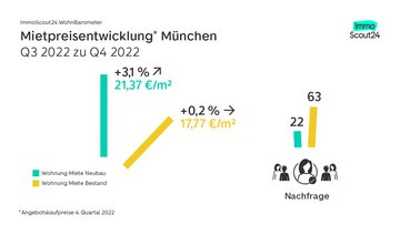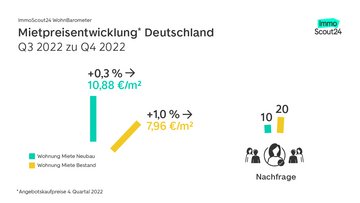 „Der Nachfragedruck lässt im Bereich Bestandsmietwohnungen kurzfristig nach. Das ist nur ein kleiner Trost, da die Nachfrage in den Metropolen dennoch auf einem sehr hohen Niveau bleibt“, kommentiert Dr. Gesa Crockford, Geschäftsführerin von ImmoScout24. „Die Einwohnerzahl Deutschlands wächst weiter. Der Neubau wird dem Bedarf nicht gerecht und auch die Bundesregierung kann ihre Neubauziele nicht halten. Wenn die Politik nicht bald wirkungsvoll das Problem angeht, spitzt sich Situation am Mietmarkt weiter zu.“