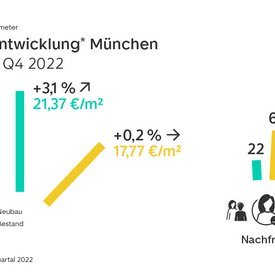 „Mieter:innen scheinen aufgrund der Sorge um die steigenden Energiekosten vermehrt nach Neubauwohnungen zu suchen, die deutlich energieeffizienter sind als der oftmals unzureichend sanierte Wohnungsbestand.“, ergänzt Dr. Crockford. „Entsprechend steigen die Nachfrage und die Angebotsmieten im Neubau deutlich stärker als im Bestand.“