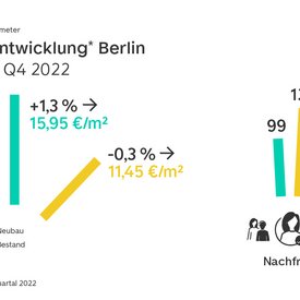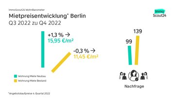 Berlin verzeichnet erstmals eine leicht rückläufige Preisentwicklung von 4 Cent auf den Quadratmeterpreis bei Bestandsmietwohnungen.