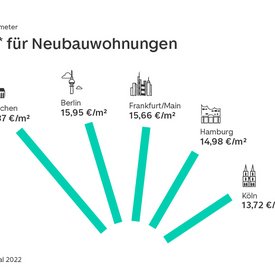 Im Neubau zeigt sich eine andere Entwicklung als im Bestand. Da die Mietpreise im Neubau unreguliert sind, steigen die Angebotsmieten für Neubauwohnungen auch im vierten Quartal deutlich. Unter den Top5 zeigt München mit plus 3,1 Prozent den stärksten Preiszuwachs im Neubau und überschreitet erstmals die Marke von 21 Euro. Stuttgart legt mit einem Plus von 4,2 Prozent eine noch größere Preisentwicklung hin, überschreitet die Marke von 16 Euro pro Quadratmeter und liegt damit auf dem zweiten Platz der teuersten Metropolen für Neubaumietwohnungen. Berlin liegt nach einem Preiszuwachs von 1,3 Prozent im vierten Quartal bei 15,95 Euro pro Quadratmeter und damit auf Platz drei. In Köln steigen die Angebotsmieten für Neubauwohnungen stärker als in Düsseldorf. Die Domstadt liegt mit einem Quadratmeterpreis von 13,72 Euro wieder knapp vor Düsseldorf mit 13,64 Euro.