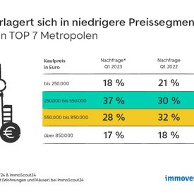 Aktuell sind Objekte der niedrigeren Preiskategorie zwischen 250.000 Euro und 550.000 Euro deutlich gefragter. Deutschlandweit wuchs der Nachfrageanteil dieser Kategorie um 6 Prozentpunkte auf 29 Prozent. In den Metropolen fiel die Verlagerung noch deutlicher aus: Hier stiegt der Nachfrageanteil um 7 Prozentpunkte auf 34 Prozent. Die preiswerteren Objekte sind in den Großstädten inzwischen am gefragtesten.