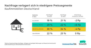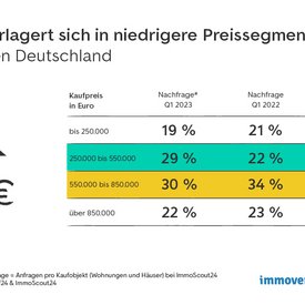 Zur Auswertung der Nachfrage wurden die Kontaktanfragen für Wohnungen und Häuser zum Kauf für verschiedene Preiskategorien auf immobilienscout24.de im 1. Quartal 2023 im Vergleich zum 1. Quartal 2022 betrachtet.