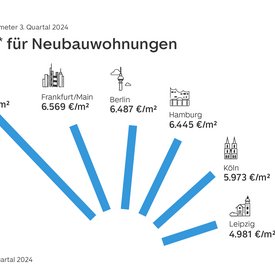 Die Preise für Neubauwohnungen bewegen sich innerhalb des dritten Quartals sowohl deutschlandweit (+0,2 Prozent) als auch in den Metropolen seitwärts. Stuttgart mit minus 0,6 Prozent verzeichnet dabei eine leichte Bewegung nach unten. Frankfurt am Main und Düsseldorf folgen mit minus 0,5 Prozent. Die positiven Bewegungen reichen von plus 0,1 Prozent in Hamburg bis plus 0,6 Prozent in München. Im Jahresvergleich zeigen vier von acht Metropolen deutliche Preiszuwächse: Während Neubauwohnungen in München (+5,5 Prozent), Berlin (+5,2 Prozent), Köln (+3,1 Prozent) und Leipzig (+2,4 Prozent) teurer sind als vor einem Jahr, können Kaufsuchende in Frankfurt am Main (-2,2 Prozent), Stuttgart (-1,7 Prozent) und Düsseldorf (-1,6 Prozent) im Vergleich zum Vorjahresquartal noch etwas sparen.