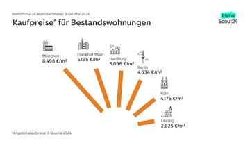 Das ImmoScout24 WohnBarometer ist der Marktreport zur Entwicklung des Immobilienmarkts. Herausgeber ist ImmoScout24: Deutschlands führende Online-Plattform für Wohnimmobilien. Das ImmoScout24 WohnBarometer gibt die Preisentwicklung in realen Angebotspreisen wieder, ergänzt um einen Indikator zum Verhältnis von Angebot und Nachfrage. Die Datenbasis umfasst über 8,5 Millionen Inserate der letzten fünf Jahre auf ImmoScout24. Die Werte werden für Referenzobjekte für den jeweils betrachtetem Immobilientyp durch einen Algorithmus aus dem Bereich des maschinellen Lernens ermittelt. Für Wohnungen zum Kauf wird eine Drei-Zimmer-Wohnung mit 80 Quadratmetern Wohnfläche zugrunde gelegt. Das betrachtete Einfamilienhaus hat 140 Quadratmeter Wohnfläche und einen Grundstücksanteil von 600 Quadratmetern. Die Kategorie Neubau enthält alle Angebote mit einem Baualter von maximal zwei Jahren zum jeweiligen Bestimmungszeitpunkt. Die aktuellen Angebotskaufpreise beziehen sich immer auf den letzten Datenpunkt im Marktreport und stehen damit für den Angebotspreis im dritten Quartal 2024.