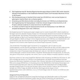 - Die Angebotspreise für Neubau-Eigentumswohnungen stiegen in Berlin 2021 weiter deutlich, stärkste Preiszuwächse in den Stadtteilen Rahnsdorf, Buch und Französisch Buchholz mit bis zu 20 Prozent.