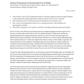 Bei den Neubauhäusern stiegen die Angebotskaufpreise vom vierten Quartal 2020 zu 2019 nicht ganz so stark. Leipzig verzeichnete den höchsten Zuwachs mit 2,9 Prozent, Berlin folgte mit 2,7 Prozent. Dresden war im vergangenen Jahr die einzige Stadt mit einer Preiskorrektur: Im vierten Quartal 2020 boten Verkäufer:innen ihre Neubauhäuser um 1,9 Prozent günstiger an als im vierten Quartal des Vorjahres.