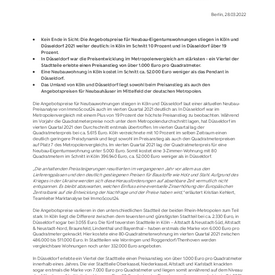 - Kein Ende in Sicht: Die Angebotspreise für Neubau-Eigentumswohnungen stiegen in Köln und Düsseldorf 2021 weiter deutlich: in Köln im Schnitt 10 Prozent und in Düsseldorf über 19 Prozent.