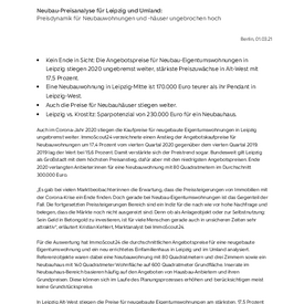 - Kein Ende in Sicht: Die Angebotspreise für Neubau-Eigentumswohnungen in Leipzig stiegen 2020 ungebremst weiter, stärkste Preiszuwächse in Alt-West mit 17,5 Prozent.