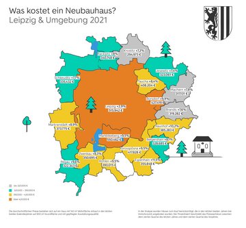 Für die Auswertung hat ImmoScout24 die durchschnittlichen Angebotspreise für eine neugebaute Eigentumswohnung und ein neu errichtetes Einfamilienhaus in Leipzig und im Umland analysiert. Referenzobjekte waren dabei eine Neubauwohnung mit 80 Quadratmetern und drei Zimmern sowie ein Neubauhaus mit 140 Quadratmeter Wohnfläche auf 600 Quadratmeter Grundfläche. Inserate im Neubauhaus-Bereich basieren häufig auf den Angeboten von Hausbau-Anbietern und ihren Grundpreisen. Diese können sich im Laufe des Planungsprozesses erhöhen und berücksichtigen meist keine Grundstückspreise.