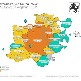 Für die Auswertung hat ImmoScout24 die durchschnittlichen Angebotspreise für eine neugebaute Eigentumswohnung und ein neu errichtetes Einfamilienhaus in Stuttgart und im Umland analysiert. Referenzobjekte waren dabei eine Neubauwohnung mit 80 Quadratmetern und drei Zimmern sowie ein Neubauhaus mit 140 Quadratmeter Wohnfläche auf 600 Quadratmeter Grundfläche. Inserate im Neubauhaus-Bereich basieren häufig auf den Angeboten von Hausbau-Anbietern und ihren Grundpreisen. Diese können sich im Laufe des Planungsprozesses erhöhen und berücksichtigen meist keine Grundstückspreise.