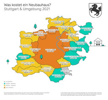 Wie stark sich die Preise rund um Stuttgart entwickelten, erkennt man auch daran, dass Anbieter:innen im Jahr 2020 in zehn umliegenden Städten für ein Neubauhaus Kaufpreise von über einer Million Euro verlangten. 2019 lagen fünf davon noch unter der Millionenschwelle. Am teuersten ist es in Gerlingen: 1,3 Millionen Euro soll der Traum vom Eigenheim hier kosten. Am günstigsten lässt sich der Wunsch vom eigenen Haus in Neuhausen mit rund 550.000 Euro erfüllen. Wer bereit ist, von Stuttgart aus 35 Kilometer weiter in den Westen zu ziehen, kann mehr als eine halbe Million Euro beim Hauskauf sparen.