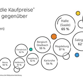 Im Metropolenvergleich ist die Differenz in der Entwicklung der Angebotskaufpreise gegenüber den Angebotsmieten in München am geringsten – und in Berlin am höchsten. In der Hauptstadt stiegen die Angebotskaufpreise um 46 Prozentpunkte stärker als die Angebotsmieten. Auch in Düsseldorf, Frankfurt am Main und Köln liegt der Index mit 45 Prozentpunkten relativ hoch. Mit 38 Prozentpunkten bzw. und 37 Prozentpunkten stiegen die Angebotskaufpreise gegenüber den Mieten in Hamburg und Stuttgart vergleichsweise weniger deutlich.