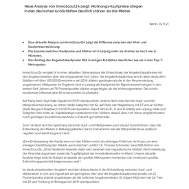 ImmoScout24 vergleicht in einer aktuellen Datenanalyse die Entwicklung der Angebotskaufpreise mit den Angebotsmieten über die vergangenen fünf Jahre. Die Angebotskaufpreise sind in allen deutschen Städten mit über 100.000 Einwohnern seit 2016 stärker gestiegen als die in der Neuvermietung angebotenen Mietpreise. Im Ergebnis sind in Leipzig die Kaufpreise für Eigentumswohnungen in den letzten fünf Jahren um 76 Prozentpunkte stärker angestiegen als die Wohnungsmieten. Das ist die deutlichste Differenz aller 80 untersuchten Großstädte.