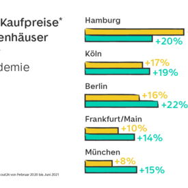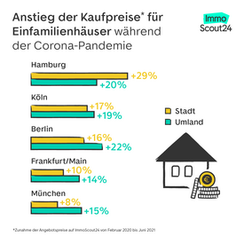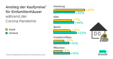 Im Berliner Speckgürtel stieg die Nachfrage nach Einfamilienhäusern zum Kauf zwischen Februar 2020 und Juni 2021 um 80 Prozent an. Die Angebotspreise kletterten von 2.479 Euro im Februar 2020 auf 3.027 Euro pro Quadratmeter im Juni 2021 – ein Plus von 22 Prozent. In der Stadt Berlin wurden Einfamilienhäuser im Juni 2021 im Durchschnitt für 5.645 Euro pro Quadratmeter angeboten, gegenüber 4.875 Euro im Februar 2020. Damit zogen innerhalb der Stadt die Angebotspreise um 16 Prozent an. Die Nachfrage stieg seit Februar 2020 um rund 77 Prozent.