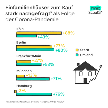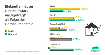 Eine aktuelle Analyse von ImmoScout24 zeigt: Die Nachfrage nach Einfamilienhäusern am Stadtrand ist unter dem Einfluss der Corona-Lockdowns um fast zwei Drittel angestiegen. Die Analyse vergleicht die Entwicklung von Nachfrage und Preisen in den Top-5-Städten sowie ihren Umlandgemeinden zwischen Februar 2020 – dem Monat vor dem ersten Lockdown – mit dem aktuellen Marktgeschehen im Juni 2021. Dabei zeigt sich ein deutlicher Anstieg der Nachfrage nach Einfamilienhäusern zum Kauf in den Speckgürteln der deutschen Metropolen.