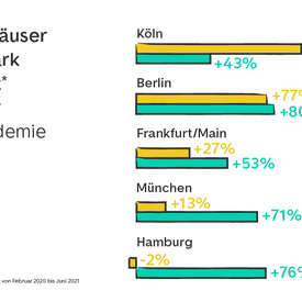 Im Randgebiet von Frankfurt am Main wuchs die Nachfrage für die inserierten Einfamilienhäuser zwischen Februar 2020 und Juni 2021 um 53 Prozent. Die Angebotspreise erlebten einen Anstieg von 3.548 Euro auf 4.052 Euro (+ 14 Prozent). Im Stadtgebiet stieg die Beliebtheitsskala für Häuser zum Kauf von Februar 2020 bis Juni 2021 um 27 Prozent. Im selben Zeitraum boten Anbieter:innen Einfamilienhäuser im Durchschnitt 10 Prozent teurer an – die Angebotspreise stiegen von 5.613 Euro auf 6.180 Euro pro Quadratmeter.