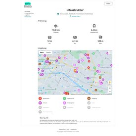 KOLUMBUS - die Standortanalyse umfasst die fünf Module Infrastruktur, Soziodemografie, Nachfrage, Preisentwicklung und Angebote. Mit dem Infrastruktur-Modul erhalten Nutzer einen raschen Überblick über die Qualität der Lage. Es stellt benachbarte Cafés und Restaurants, Supermärkte, Parkplätze, Kindergärten und Schulen, Tankstellen, Einkaufsmöglichkeiten, Theater und Kinos sowie die Anbindung an den öffentlichen Nahverkehr in einer Kartenansicht dar.