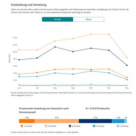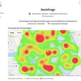 Im Nachfrage-Modul stellt eine Heatmap die Nachfrage-Situation vor Ort als interaktive Karte auf Basis der Gesuche auf ImmoScout24 dar. Der Radius um den gewählten Standort kann in verschiedenen Stufen von 1 bis 50 Kilometer gewählt werden. Der Betrachtungszeitraum lässt sich von 6 Monaten bis 3 Jahren konfigurieren. Das neue Daten-Tool gibt automatisch die prozentuale Verteilung von Gesuchen nach Zimmeranzahl sowie die Preis- und Größenspannen der Suchanfragen an - ideal um die Nachfragesituation und Preisbereitschaft verlässlich zu beurteilen. Zudem kann die Nachfrage nach verschiedenen Zimmeranzahlen und Flächengrößen im Zeitverlauf betrachtet werden.