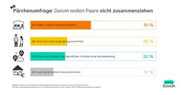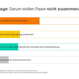 Der meistgenannte Grund für einen aufgeschobenen Zusammenzug ist der persönliche Freiraum (51 Prozent). 25 Prozent der Befragten halten ihre Beziehung noch nicht für gefestigt genug für das gemeinsame Zuhause. Auch berufliche oder private Gründe hindern viele. Steigende Immobilienpreise in Deutschland sind hingegen nur für 12 Prozent der Befragten ein Grund, das Alleinsein aufzugeben.