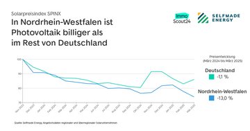 Der Solarpreisindex (SPINX) von Selfmade Energy und ImmoScout24 zeigt, dass die monatlichen Preise für die Installation von Solaranlagen ohne Batteriespeicher besonders in Nordrhein-Westfalen stark gesunken sind.