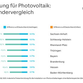 Während die Installationskosten von Photovoltaikanlagen bundesweit im Schnitt um +5,7 Prozent steigen, können sich Hausbesitzer:innen in zwei Bundesländern über sinkende Preise freuen: Das Saarland verzeichnet mit -6,7 Prozent den stärksten Kostenrückgang, gefolgt von Nordrhein-Westfalen mit -1,5 Prozent.