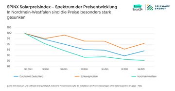 Der SPINX misst die Preisentwicklung für Solaranlagen ohne Batteriespeicher auf Basis von über einer Million monatlicher Angebotsdaten regionaler und überregionaler Solarunternehmen (Referenzwert: Q4 2023 = 100). Die Quartalsauswertung bezieht sich jeweils auf den letzten Monat des Quartals. Berücksichtigt werden Anlagen mit 12 bis 25 Modulen – der typische Größenbereich für Einfamilienhäuser.