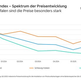 Der Jahresvergleich zeigt einen deutlichen Trend zu niedrigeren Preisen. Im deutschen Durchschnitt ist die Installation einer Photovoltaikanlage ohne Speicher um -6,6 Prozent günstiger geworden. Besonders stark gefallen sind die Preise in Bremen (-13,1 Prozent) sowie in Hamburg und Niedersachsen mit jeweils -12,1 Prozent. Damit liegen diese drei Bundesländer zwischen 5,5 und 6,5 Prozentpunkten unter dem Bundesdurchschnitt. Auch Berlin zeigt mit -11,2 Prozent einen deutlichen Preisrückgang. Die geringsten Kostensenkungen gab es in Baden-Württemberg (-3,6 Prozent) und Hessen (-5,4 Prozent). Auch in Bayern (-6,1 Prozent) und Thüringen (-6,2 Prozent) sind die Preise nicht so stark gesunken wie im deutschen Durchschnitt.