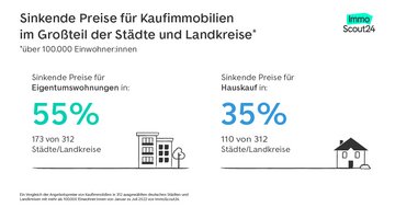 Die Kaufpreise für auf ImmoScout24 angebotene Eigentumswohnungen sinken seit Jahresbeginn in einem Großteil der deutschen Städte und Landkreise mit mehr als 100.000 Einwohner:innen. In 173 von 312 Städten und Landkreisen sinken die Angebotspreise für Wohnungen zum Kauf. Bei Häusern zum Kauf ist ein ähnlicher Trend zu beobachten, allerdings in abgeschwächter Form. In rund einem Drittel der Städte und Landkreise sinken die Angebotspreise für Häuser zum Kauf.