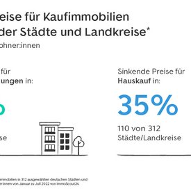 Für die Analyse der Angebotspreisentwicklung wurden Kaufimmobilien in 312 ausgewählten deutschen Städten und Landkreisen mit mehr als 100.000 Einwohner:innen von Januar zu Juli 2022 von ImmoScout24 berücksichtigt.