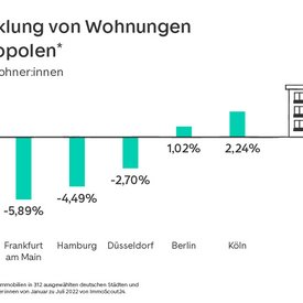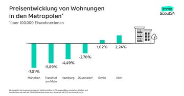 Die Städte und Landkreise ab 100.000 Einwohner:innen zeigen eine gemischte Entwicklung. In einigen Landkreisen, wie Oberspreewald-Lausitz, Wartburgkreis oder Herzogtum Lauenburg sind Preissenkungen für Eigentumswohnungen von 20 bis 30 Prozent zu beobachten, allerdings bilden diese die Ausnahme. Im Mittelwert sinken die Quadratmeterpreise um 6,2 Prozent. Und auch in fünf der sieben Metropolen sinken die Angebotspreise. München sieht mit -7,0 Prozent den größten Preisrückgang seit Jahresbeginn, gefolgt von Frankfurt am Main (-5,9 Prozent), Hamburg (-4,5 Prozent), Düsseldorf (-2,7 Prozent) und Stuttgart (-2,5 Prozent). Einzige Ausnahme bilden Berlin und Köln. Hier steigen die Angebotspreise seit Januar moderat um 1 und 2,2 Prozent an.