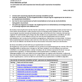 Die Rangliste der zehn teuersten Immobilien auf Sylt, gemessen am Quadratmeterpreis der Inserate, führt eine Doppelhaushälfte in Holzbauweise in Kampen an. Bei einem Kaufpreis von 4,85 Millionen Euro und einer Wohnfläche von 120 Quadratmetern wird das Ferienhaus mit vier Zimmern und Garten für 40.417 Euro pro Quadratmeter angeboten. Ein Reihenmittelhaus mit 90 Quadratmetern Wohnfläche, Garten und Tiefgaragenstellplatz ist für rund 36.000 Euro pro Quadratmeter im Angebot und ist damit das zweitteuerste Haus, das aktuell bei ImmoScout24 inseriert ist. Auf den Plätzen drei bis zehn der teuersten Immobilien auf Sylt werden Angebotspreise zwischen 21.000 Euro und 28.000 Euro je Quadratmeter Wohnfläche aufgerufen.