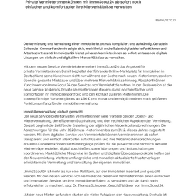 Die Vermietung und Verwaltung einer Immobilie ist oftmals kompliziert und aufwändig. Gerade in Zeiten der Corona-Pandemie zeigte sich, wie hilfreich und effizient digitalisierte Funktionen und Arbeitsschritte sind. ImmoScout24 bietet privaten Vermieter:innen ab sofort umfassende digitale Lösungen, um einfach und digital ihre Mietverhältnisse zu verwalten.