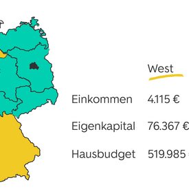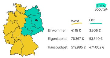 Der Großteil der Unterschiede lässt sich auch 30 Jahre nach der Wiedervereinigung mit Unterschieden in den finanziellen Ressourcen zwischen den neuen und alten Bundesländern erklären. Im Westen stehen den Bauwilligen laut ihren eigenen Angaben auf ImmoScout24 mit 76.367 Euro 43,2 Prozent mehr Eigenkapital zur Verfügung als im Osten. Hier liegt das Eigenkapital im Mittel bei 53.340 Euro. Auch das monatliche Einkommen unterscheidet sich zwischen den Häuslebauern im Westen und Osten: Im Westen stehen mit 4.115 Euro im Monat knapp 209 Euro mehr zur Verfügung als im Osten mit 3.906 Euro. Kein Wunder also, dass sich auch das Maximalbudget für den West-Hausbau mit 8,9 Prozent abhebt. 519.985 Euro soll der Bau des West-Wunschhauses im Mittel kosten, das Traumhaus im Osten hingegen 474.002 Euro.